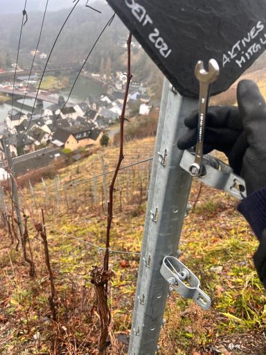Über den Winter wirken starke Belastungen auf die Drähte. Temperaturschwankungen, Wind und Schneelast führen dazu, dass sich Drähte lockern oder beschädigt werden. Wird in diesem Zustand gebunden, hängen die Fruchtruten später durch, die Laubwand wird unruhig und es entstehen Nachteile bei Belüftung, Pflanzengesundheit und Ertrag. Ein korrekt gespanntes Drahtgerüst sorgt dagegen für Halt, klare Strukturen und gleichmäßige Wuchsbedingungen über die gesamte Anlage hinweg.