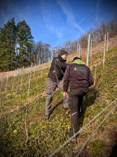 Unter der Anleitung von Christopher Beck, der vom Wegrand aus den Überblick behielt, ging es Rebe für Rebe voran. Altes Holz weichen lassen, Kräfte lenken, den richtigen Trieb auswählen. Kein schneller Job, sondern konzentrierte Arbeit mit viel Erfahrung, Gefühl und Respekt vor der Pflanze. Denn was jetzt geschnitten wird, prägt Wuchs, Trauben und Charakter des Weins.