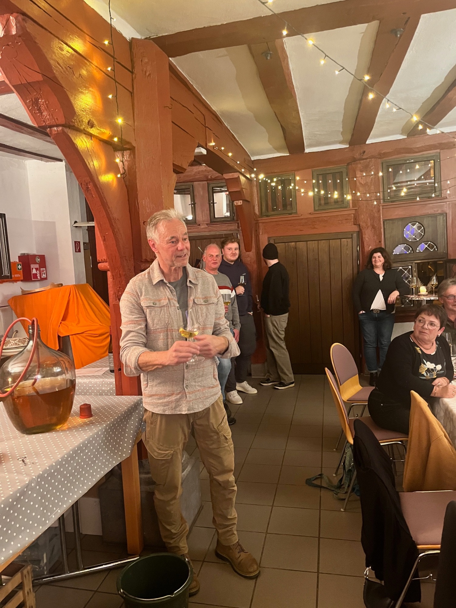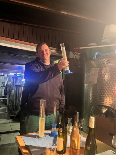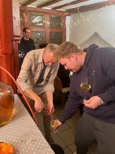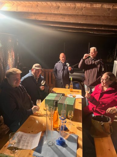 Christopher Beck stellte uns im ersten Teil unserer Vorstandsitzung die neuen Weine vor, die aktuell noch im Fass lagern. In mehreren Verprobungsschritten verkosteten die Anwesenden die Jungweine Souvignier Gris und Cabernet Cortis – derzeit rund 280 Liter bzw. 150 Liter. Zum Vergleich brachte Herr Merz jeweils eine Flasche der Weine des Jahrgangs 2024 mit, während Herr Beck die aktuellen Analysewerte erläuterte.